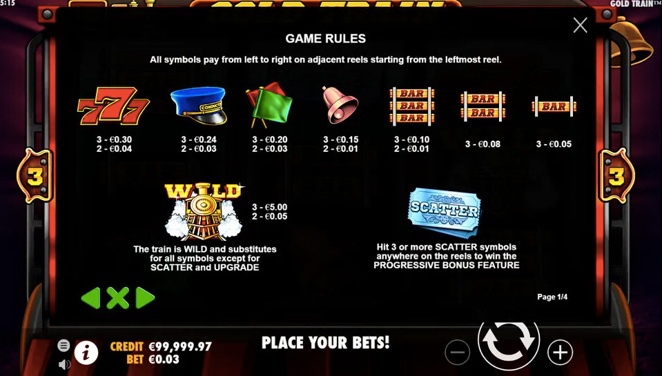 황금 기차는 전통적인 3×3 슬롯에서 플레이되며, 가로로 세 줄의 지불 라인이 장착되어 있습니다. 지불을 받으려면 두 개 또는 세 개의 릴에 일치하는 심볼을 놓아야 합니다.