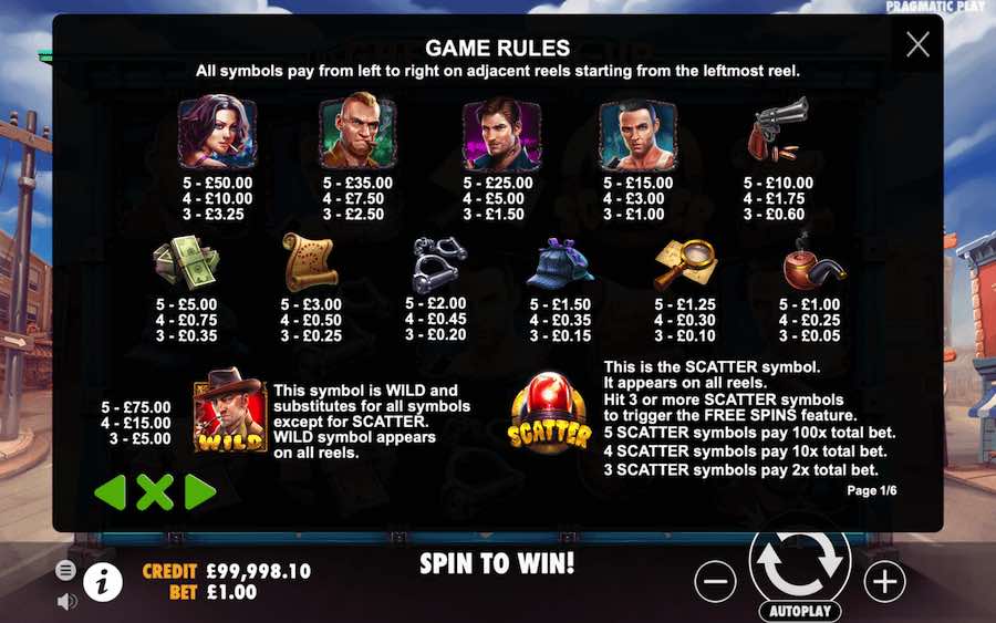 게임 배당표에는 파이프, 돋보기, 모자, 수갑, 지도, 지폐 등 낮은 값을 나타내는 다양한 항목이 있습니다. 프리미엄 기호에는 총과 범죄 조직의 세 남자 캐릭터가 포함됩니다. 가장 고액의 상징은 여성의 수모자로, 5장의 승리에 대해 베팅의 50배가 보상으로 주어집니다. 또한 파이프 흡연의 무법자의 형태로 와일드 기호도 있습니다. 이 기호는 모든 일반 기호를 대체 할뿐만 아니라 페이 라인의 승리 라인에 대해 베팅의 75 배를 지불합니다.